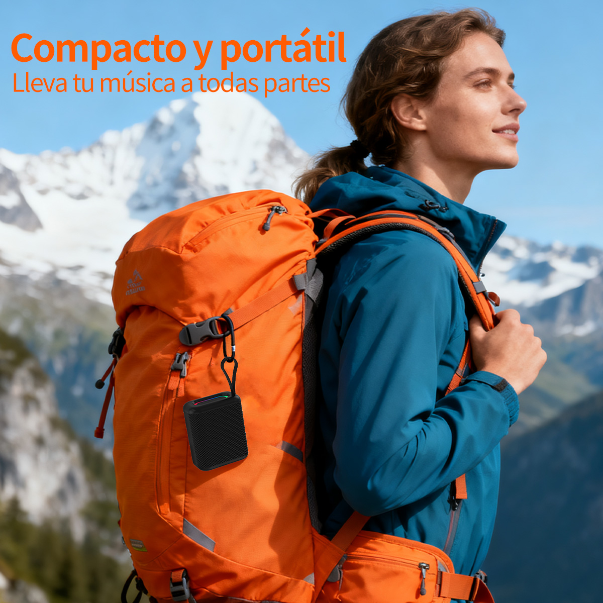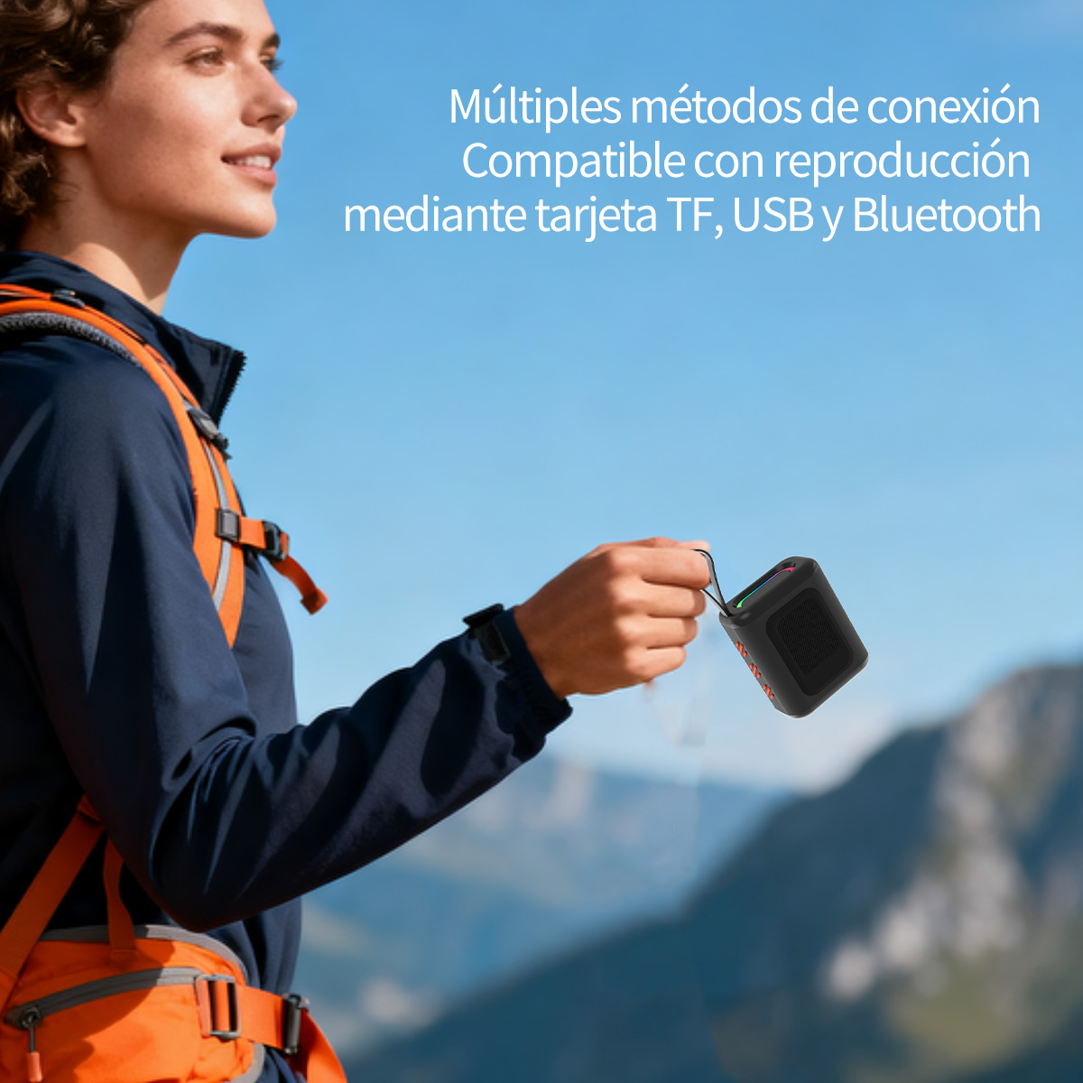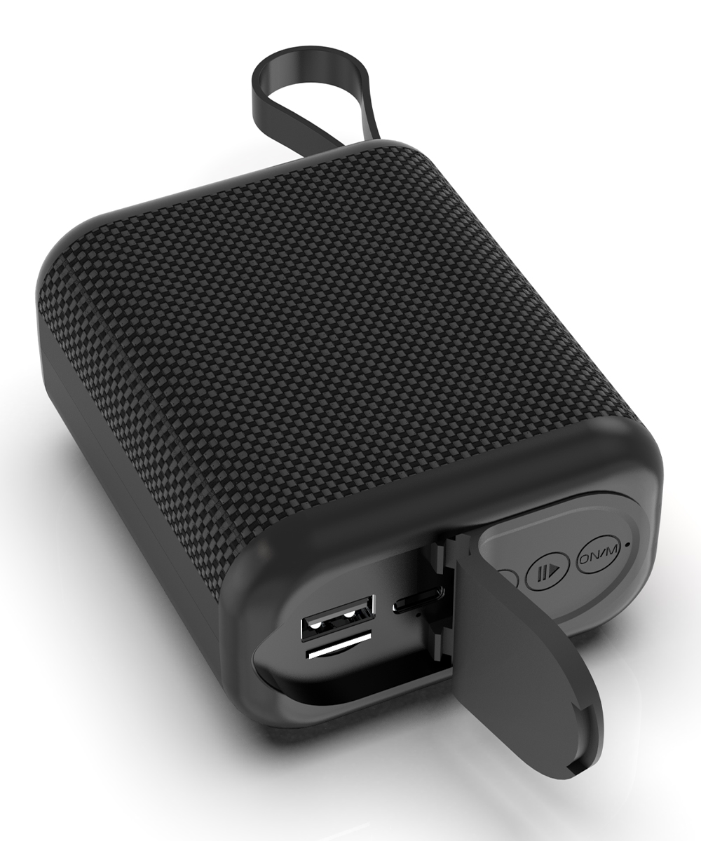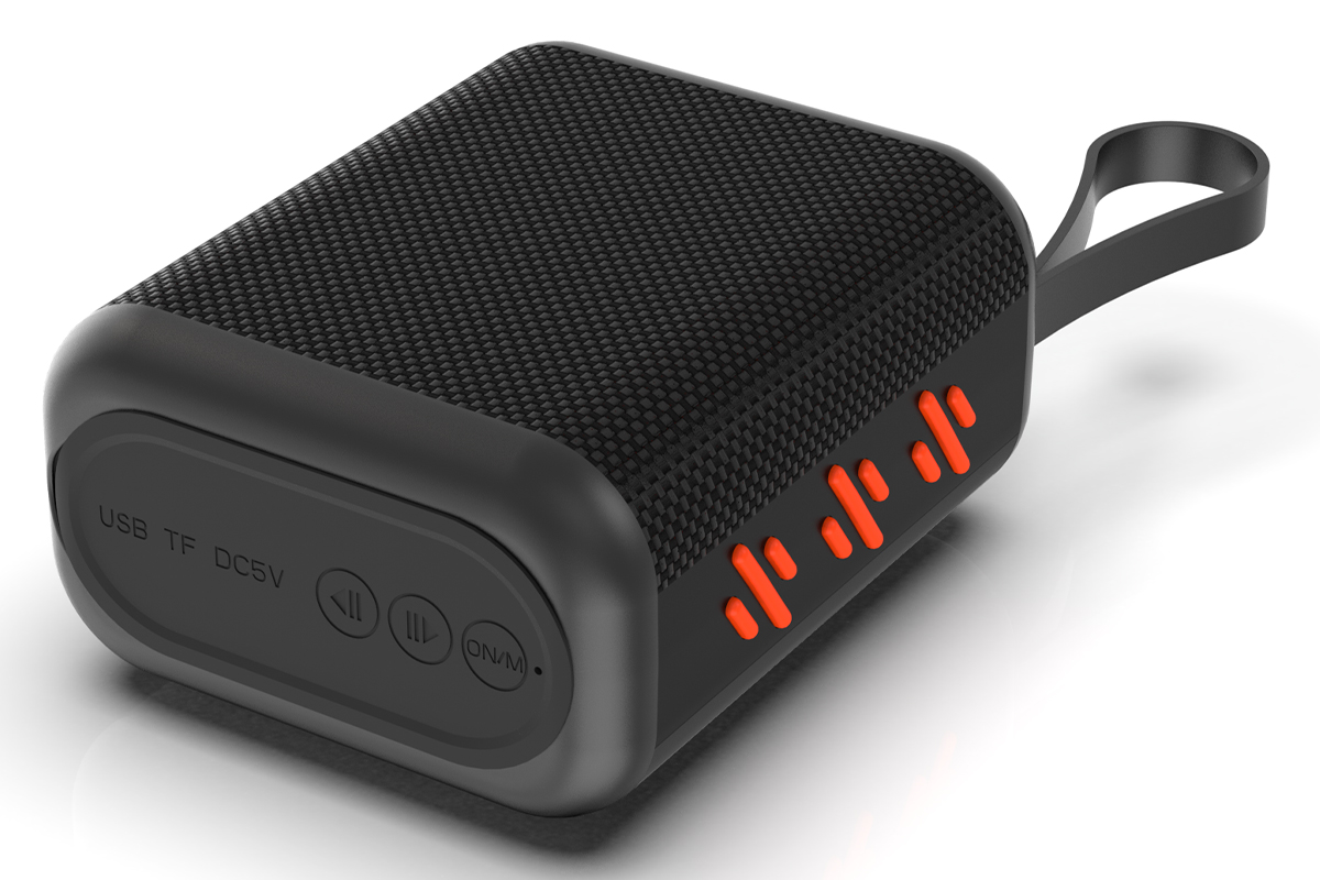 Portable waterproof BT5.3 speaker with 5W bass, RGB rhythm lights, TF card, hands-free, FM radio. 1200mAh battery for 4-8hrs playtime, eco-friendly ABS+fabric, 217g. Available in black/white/blue, ideal for outdoor use.